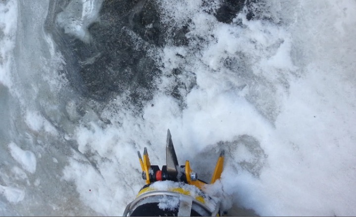 The second pitch was an easy cruise up a snow covered WI3 that lead to a fun and featured 50m WI4. The top was slightly scary. I broke through the candy shell ice, exposing that it wasn’t actually connected to the wall. In fact, it was roughly five feet away from the wall and I could stick my head through the hole and see almost all the way to the bottom of the falls.