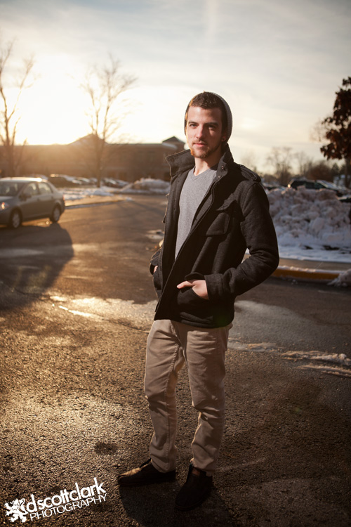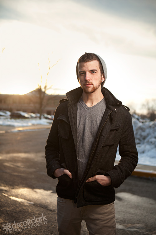 Here we are experimenting with light position. Mixing flash with a good ambient exposure works in this example. The ambient light on the model’s face still shows enough details, and the sun’s highlight along with the flash fired from behind the model’s position highlight the structure of his face. Also, keep in mind to keep the flash high or you’ll get a very distracting shadow cast from the model’s shoulder.